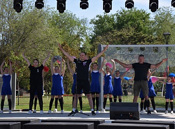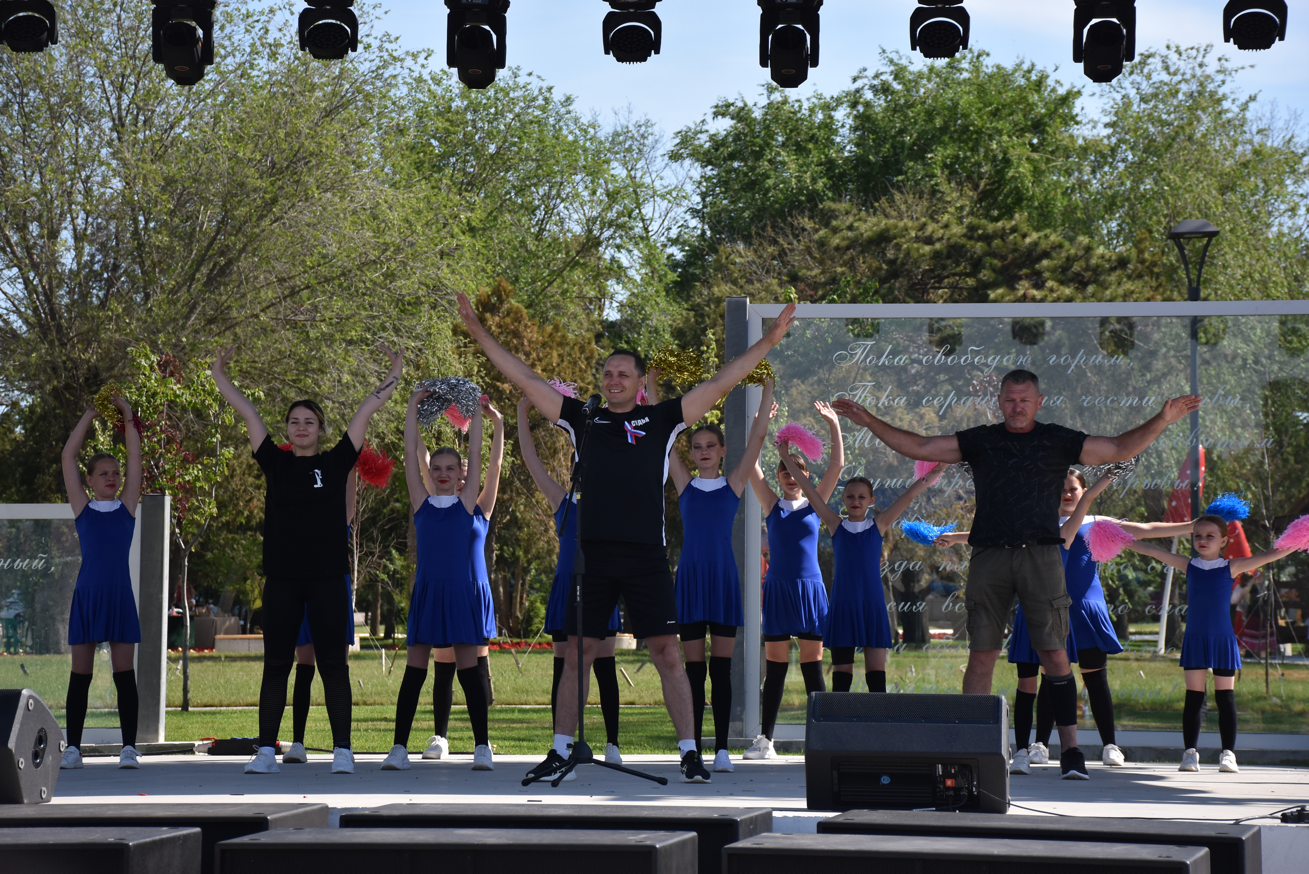 Утро продолжилось энергичной зарядкой, которую провели чемпион Краснодарского края по армрестлингу Вячеслав Полищук, тренер по фитнесу Алексей Маркварт, тренер по художественной гимнастики Марина Тихомирова, хореографический ансамбль «Юность».