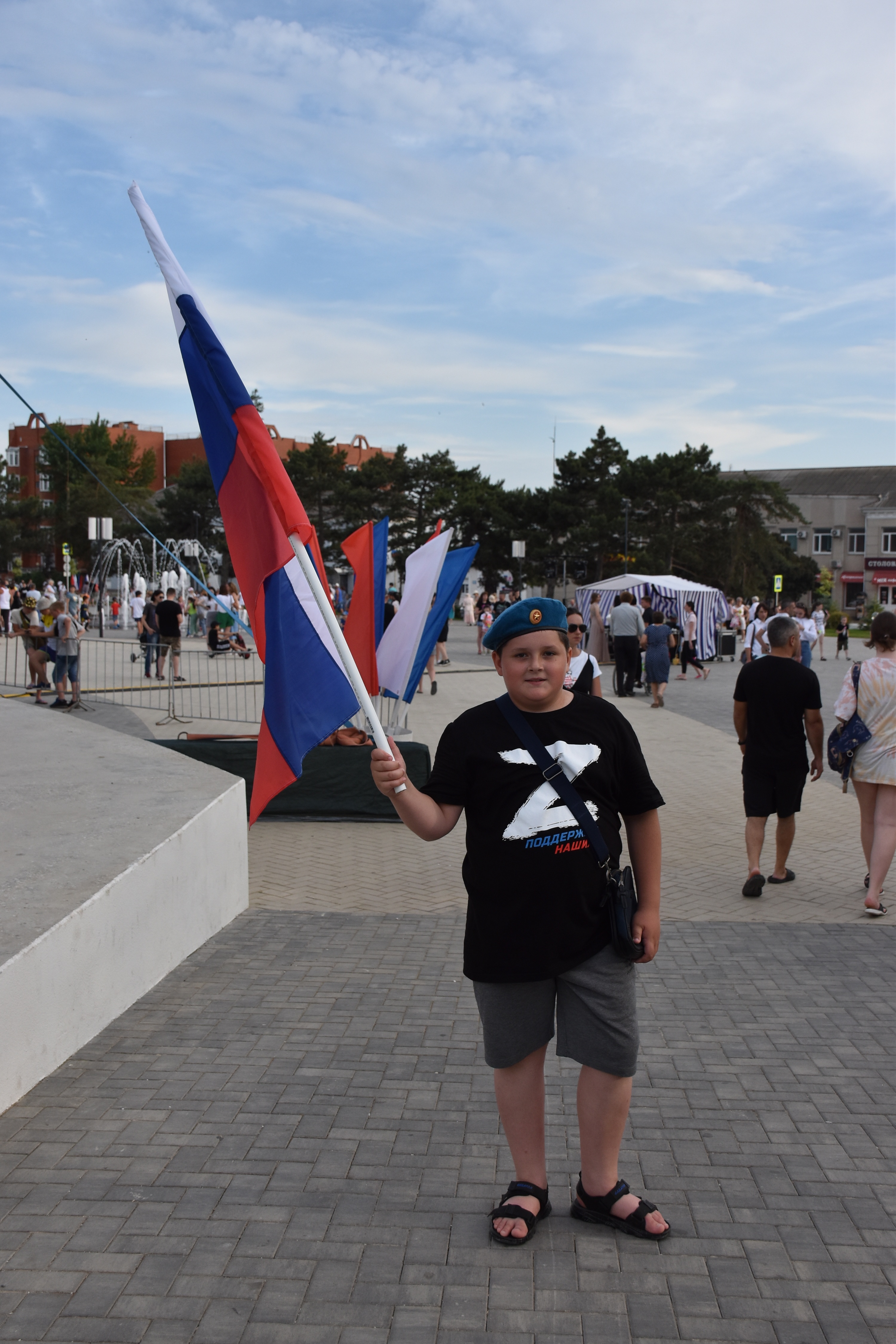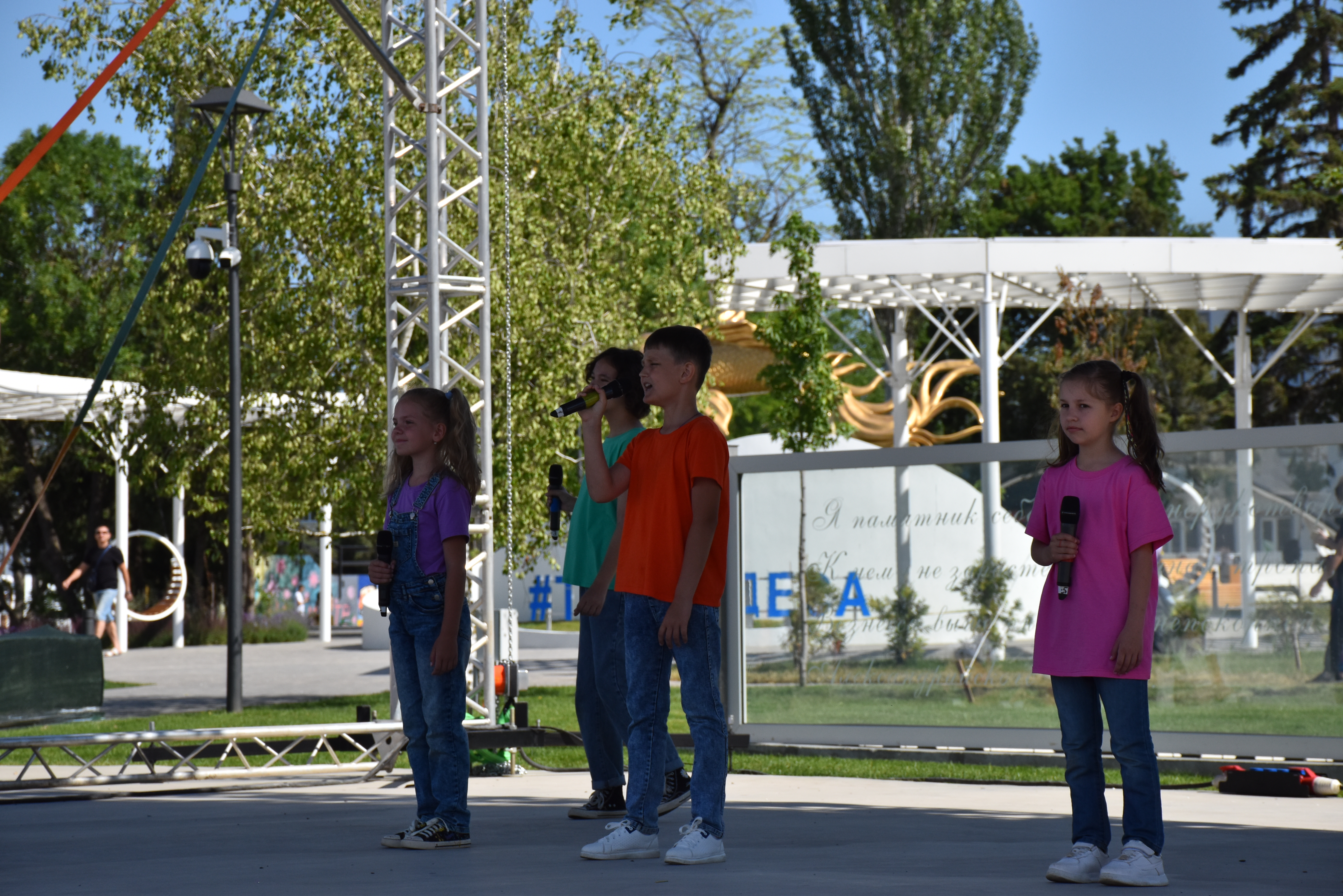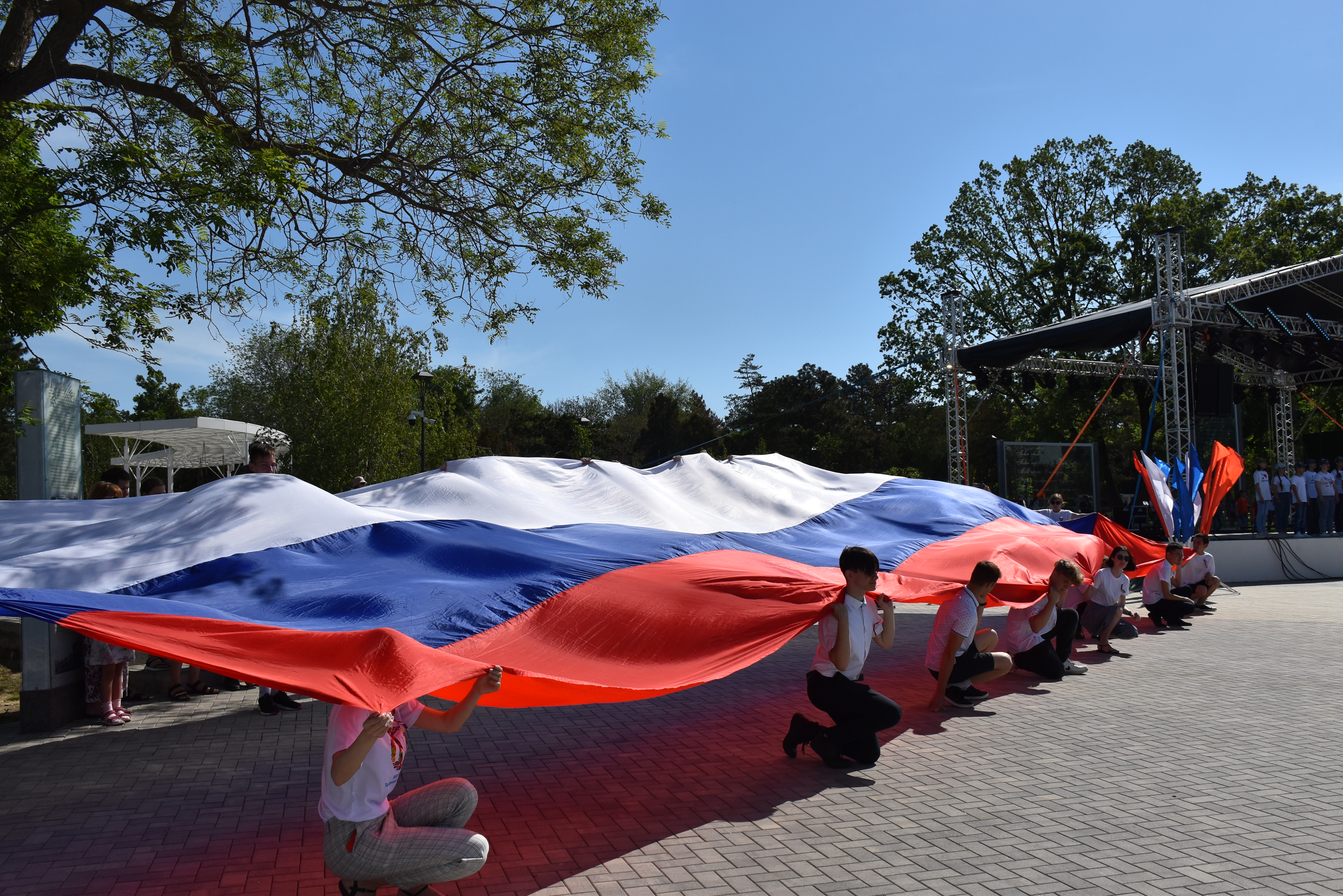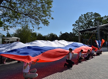 В парке Пушкина работали тематические площадки «Россия – это Я». Ребята участвовали в историческом путешествии, на котором отвечали на вопросы викторины, рисовали флаги, писали поздравления с Днём России.