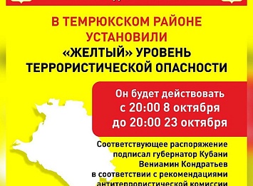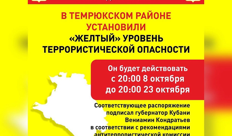 В Темрюкском районе Краснодарского края до 20:00 23 октября установили «желтый» уровень террористической опасности. Соответствующее распоряжение подписал Вениамин Кондратьев.